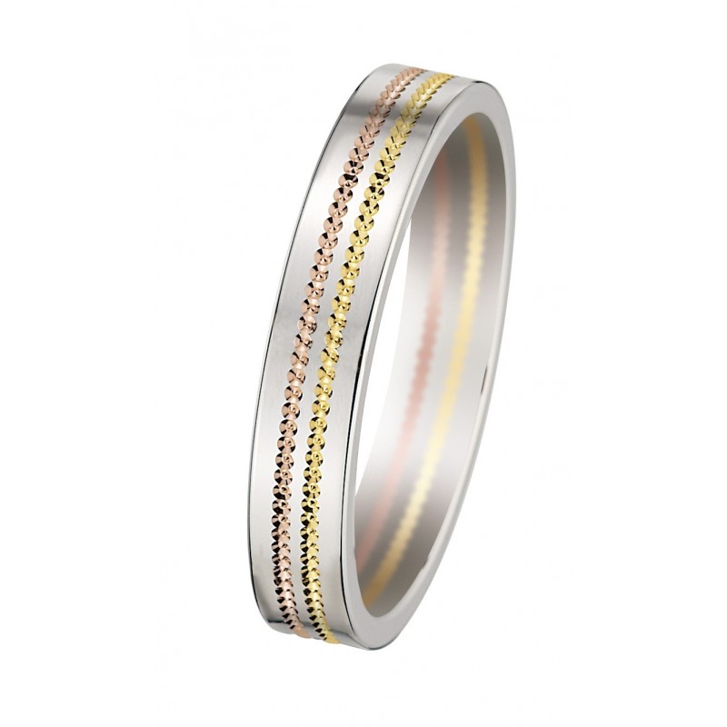 Offrez-vous une sublime bague de mariage tricolore, mélangeant parfaitement l'or blanc, jaune, et rose.