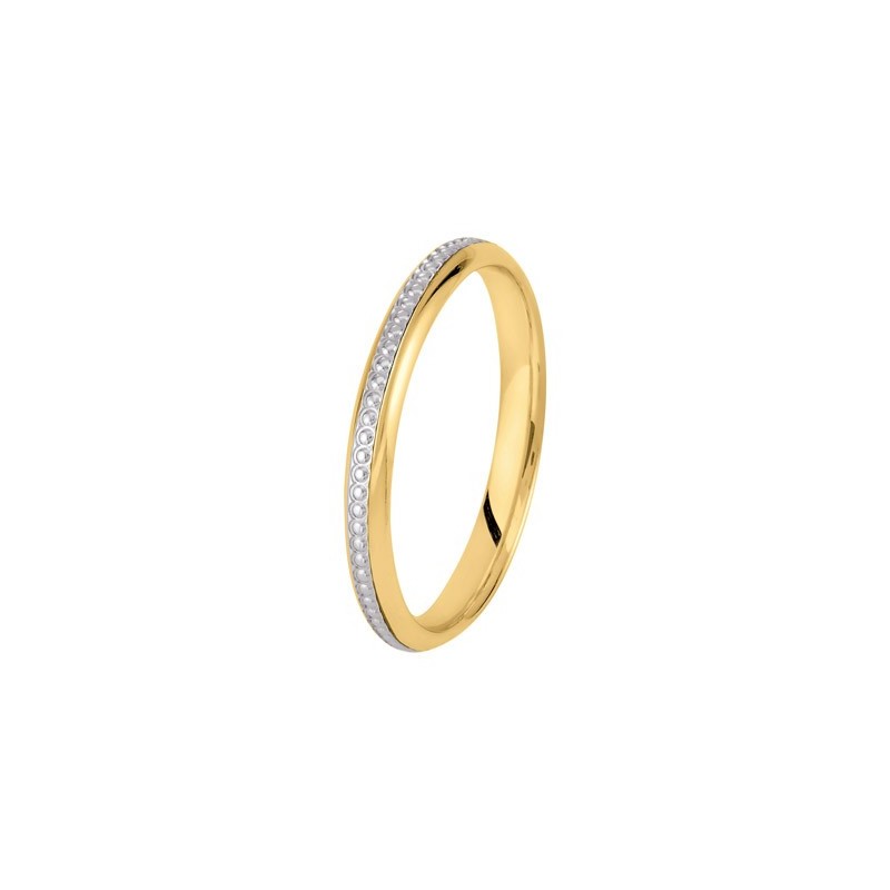 Une belle alliance de mariage bicolore, avec de l'or jaune, et de l'or blanc avec un effet perlé.