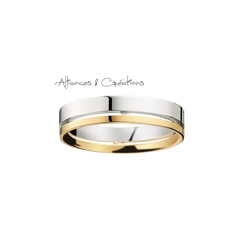 Alliances & Créations vous présente une alliance de mariage qui mélange l'or blanc et l'or jaune. Cet anneau est disponible en or rose, avec ou sans diamants.