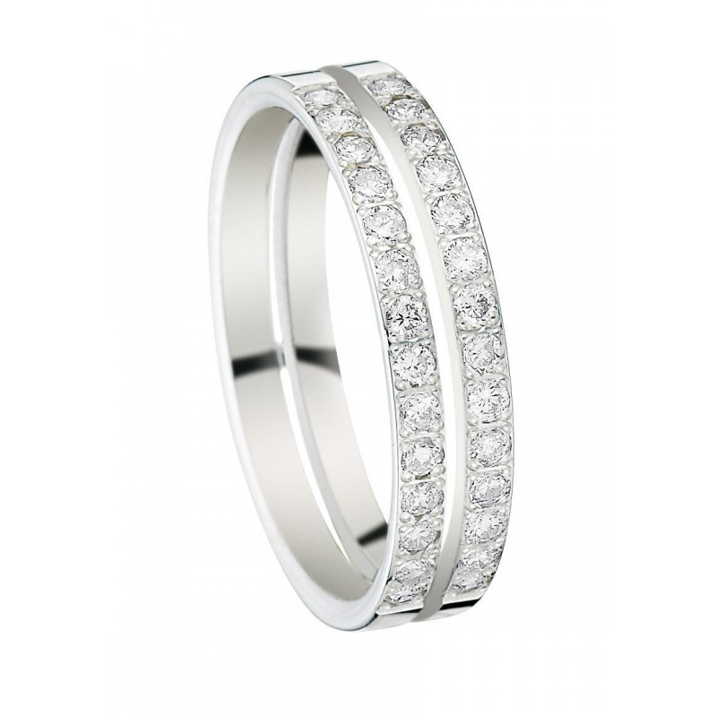 Opter pour une alliance de mariage en or blanc avec des diamants. La bague est séparée en deux anneaux, avec des diamants sur le dessus de l'alliance. Alliances & Créations vous propose de modifier/personnaliser votre bague, vous choisissez l'or ainsi que les pierres précieuses que vous voulez.