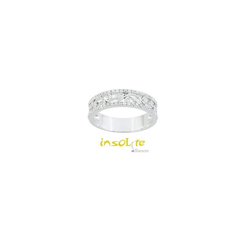 Laissez-vous tenter par une alliance de mariage en or blanc, avec des motifs fleuris au centre de l'anneau et qui en font le tour complet. Sur les deux bords de l'alliance, un tour complet en diamants est présent.