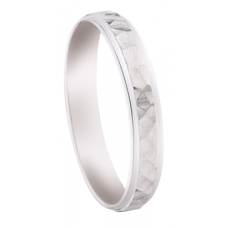 Cette ravissante bague de mariage est en or blanc avec un anneau central martelé.