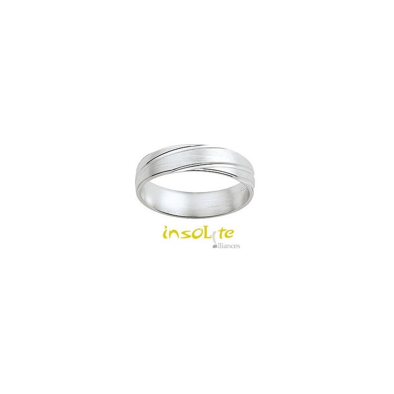 Venez découvrir cette splendide alliance de mariage entièrement en or blanc, avec deux rainures qui traverse l'anneau en diagonale. Chez Alliances & Créations, cette bague existe en or jaune ou rose, ou en argent, avec ou sans diamants. Vous pouvez également ajouter des motifs sur votre alliance ou en modifier la forme.