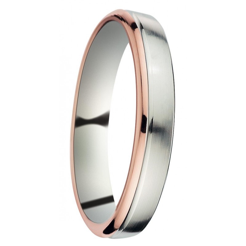 Une magnifique alliance de mariage en or blanc, avec une fine ligne en or rose sur un des deux côtés.