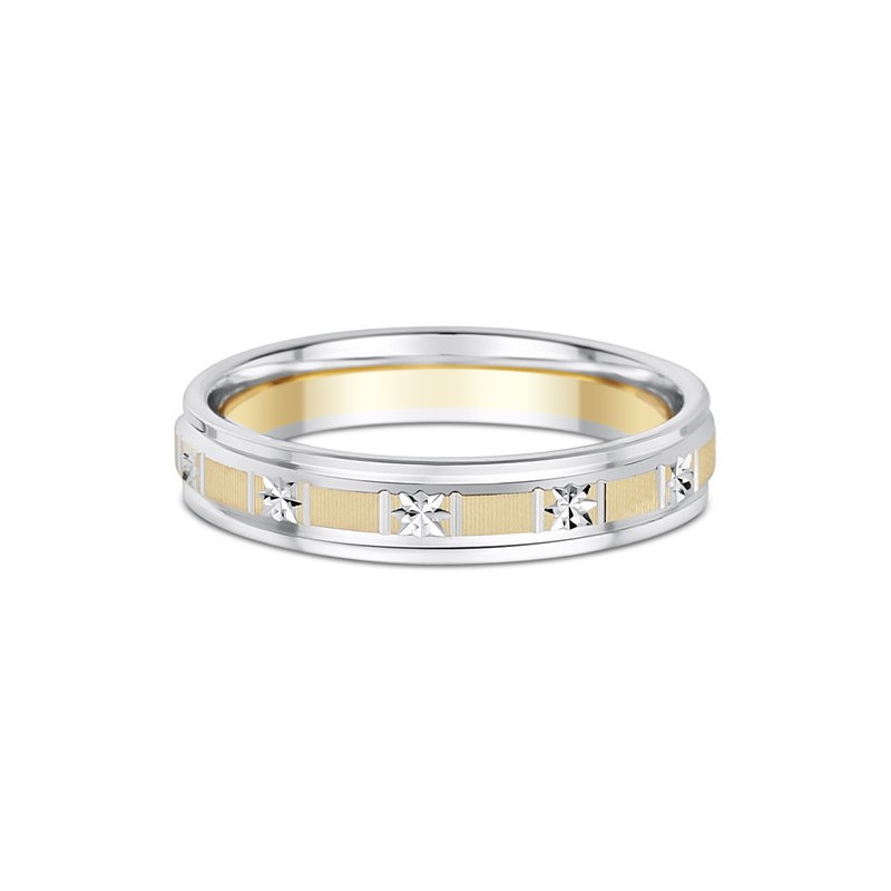 Cette alliance de mariage alterne entre l'or jaune et l'or blanc. Des motifs étoilés présent apporte de l'originalité mais également de la grâce.