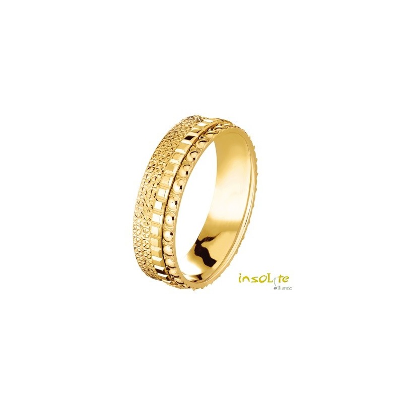 Venez à la découverte d'une alliance de mariage entièrement en or jaune, avec un magnifique effet diamanté et des motifs perlés et carrés. Chez Alliances & Créations, vous avez la possibilité de vous inspirer d'une alliance de mariage déjà existant pour la modifier par la suite, pour obtenir une bague de mariage qui vous correspond et qui est à votre image. Vous avez le choix de la couleur de l'or, ou du choix des matériaux, ainsi que la forme ou les motifs de votre future bague.