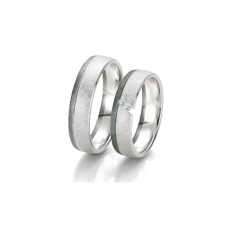 Optez pour une alliance de mariage en or blanc brossé, avec deux diamants disposés au centre de l'anneau. Chez Alliances & Créations, vos bagues existent en or jaune, rose ou blanc, avec ou sans diamants. Modification possible de la forme, la taille et les motifs de votre futur anneau.