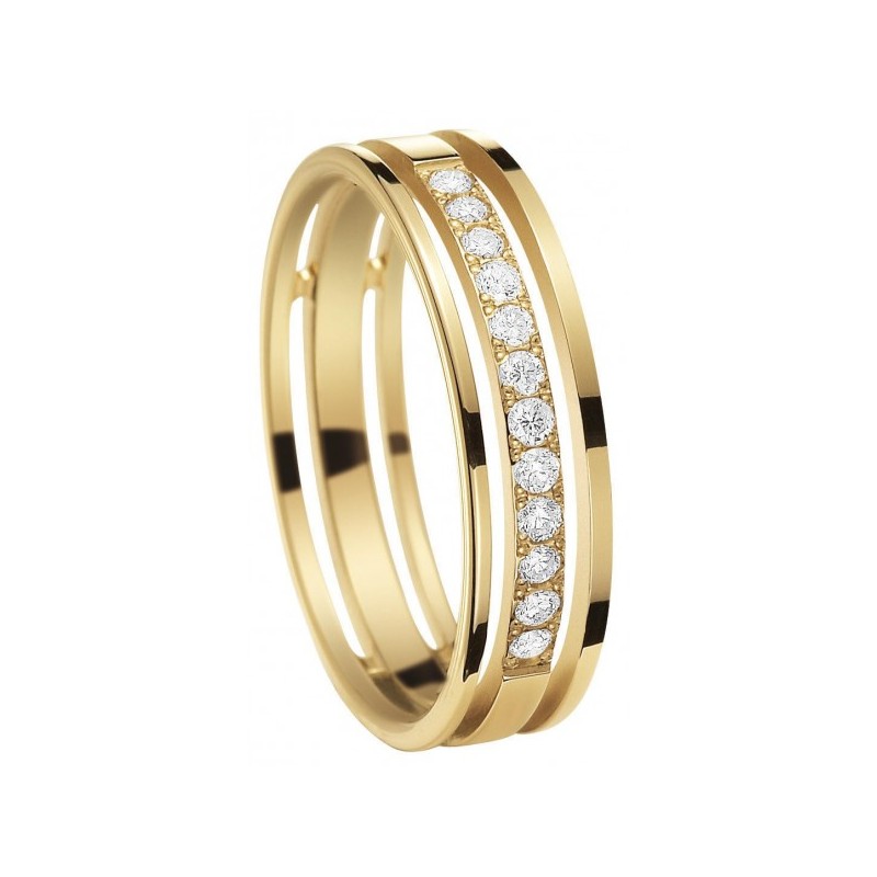Nous vous présentons une magnifique alliance de mariage en or jaune. Cette bague est séparé en trois anneaux ajourée, avec un demi-tour en diamants. Toutes nos alliances sont disponibles en or jaune, blanc ou rose, avec ou sans diamants. La forme et les motifs de votre future alliances sont modifiables.