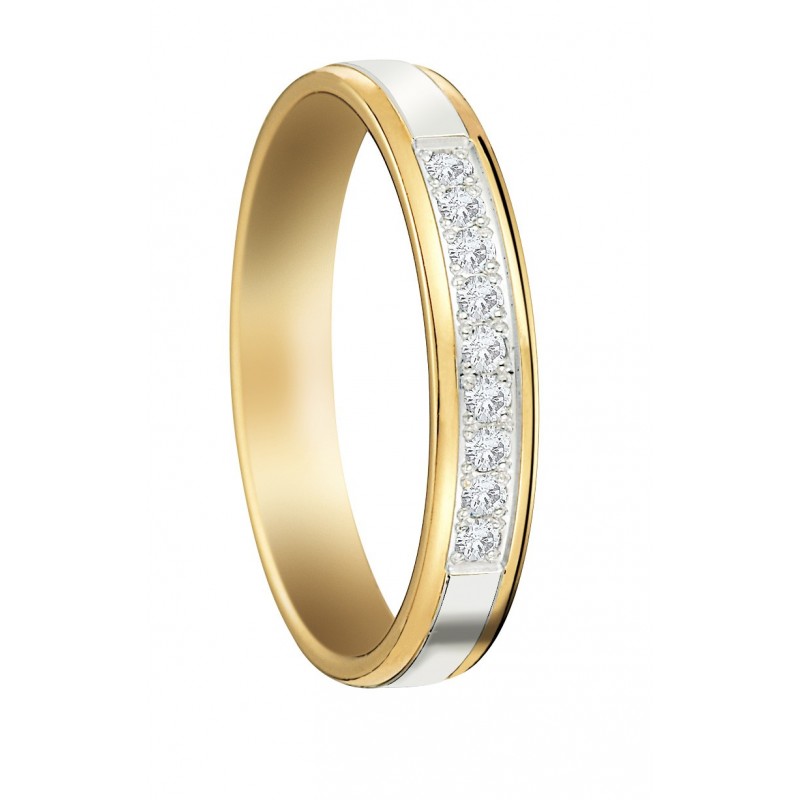 Venez découvrir une alliance de mariage bicolore. Les côtés sont en or jaune, avec au centre une ligne en or blanc et un rang de diamants. Toutes nos alliances sont disponibles en or jaune, rose, ou blanc, avec ou sans diamants, le design et la forme sont également modifiables.