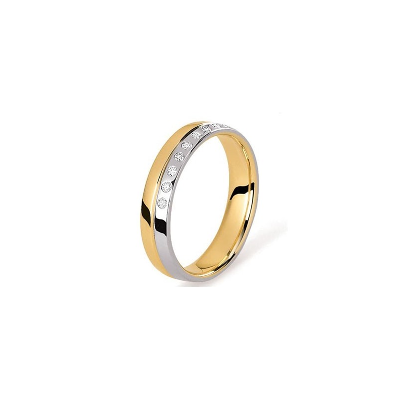 Nous vous proposons une alliance de mariage de largeur 5 mn, en or blanc & jaune. Des diamants sont disposés sur l'or blanc sur la moitié de l'anneau. Cette bague est disponible en or rose, sans diamants. La forme et le design sont aussi personnalisables.