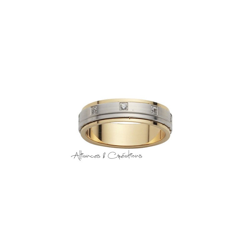 Voici une alliance de mariage bicolore en or blanc & jaune, avec plusieurs diamants. Avec Alliances & Créations profitez de la personnalisation de nos produits. En effet nous modifions toutes nos bagues sur demandes.