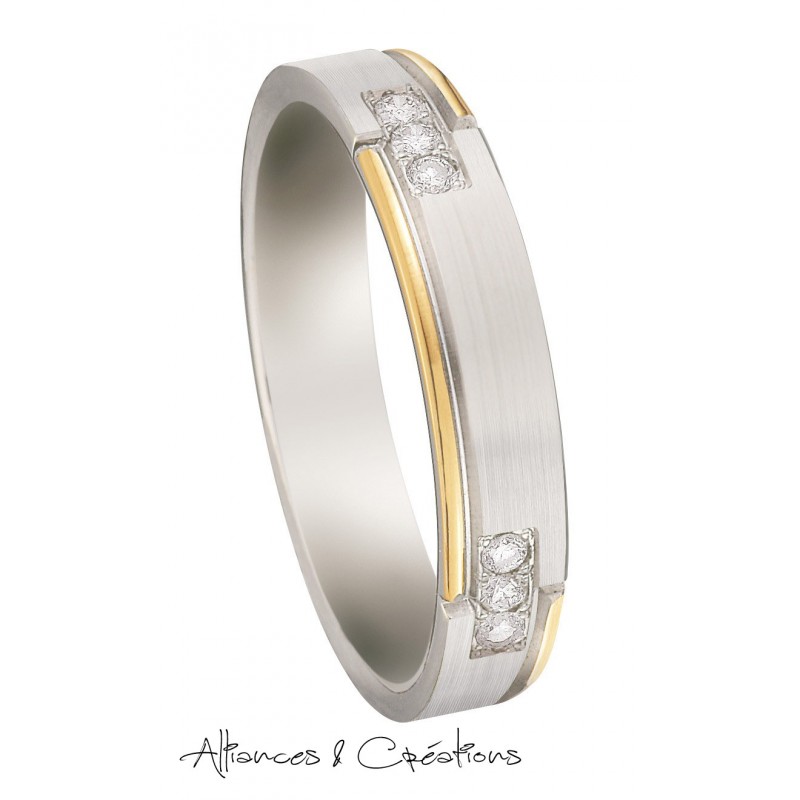 Le créateur Pfertzel-Fairbelle vous présente une alliance de mariage en or jaune sur les côtés et en or blanc au centre, avec des rangées de trois diamants tout autour de l'anneau.