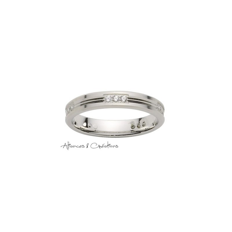 Alliances & Créations vous présente une bague de mariage en or blanc avec des rangée de 3 diamants tout au long de l'anneau. Cet anneau est disponible en or jaune ou rose, avec ou sans diamants.