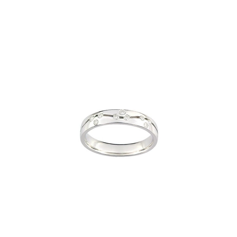 Le créateur GIRARD vous présente une alliance de mariage en or blanc accompagné de neuf diamants disposés sur le dessus de la bague. Toutes nos alliances sont modifiables, cette bague est disponible en or rose, et jaune, mais aussi avec ou sans diamants. Vous pouvez également modifier le design de la bague.